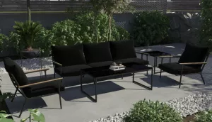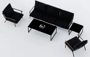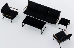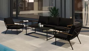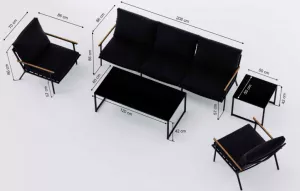 Материалы и цвета: каркас мебели выполнен из всесезонного алюминия с порошковым покрытием темно-серого цвета (карбон), подлокотники кресел и дивана декорированы вставками из тика, подушки спинок и сидений обшиты уличной тканью черного цвета (А13814) с водоотталкивающей пропиткой, толщина подушек сидений 10 см, столешница кофейного и журнального столиков глянцевая, изготовлена из закаленного стекла толщиной 5 мм с нанесением черного цвета с помощью шелкотрафаретной печати.