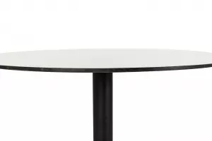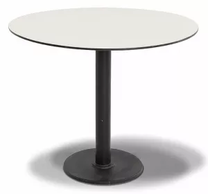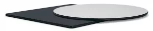 Круглый стол со столешницей из HPL молочного цвета. Это высококачественный ударопрочный компакт-пластик, обладающий низкой пористостью, что предотвращает впитывание жидкостей, поэтому столы из HPL идеально подходит для обеденных зон. Толщина столешницы 12 мм.