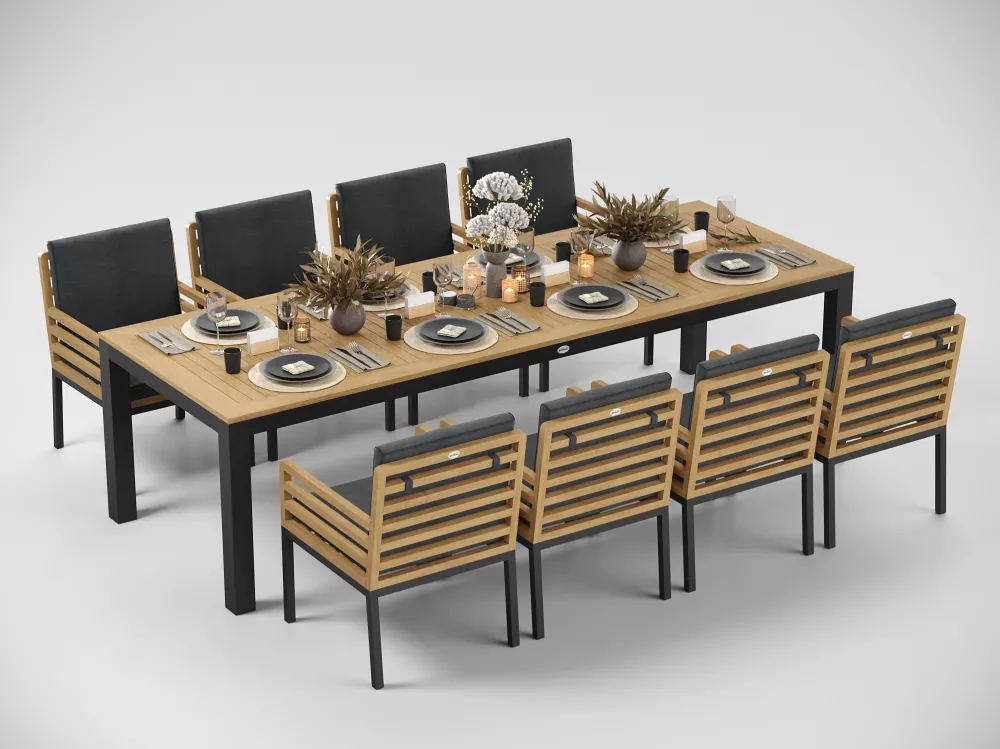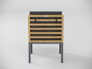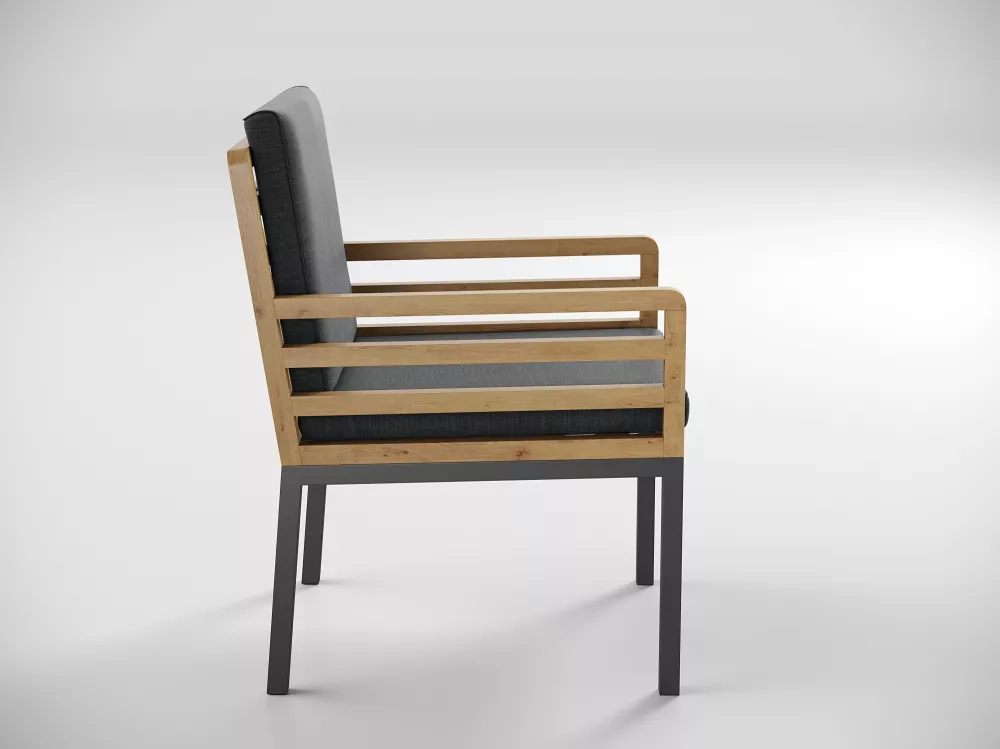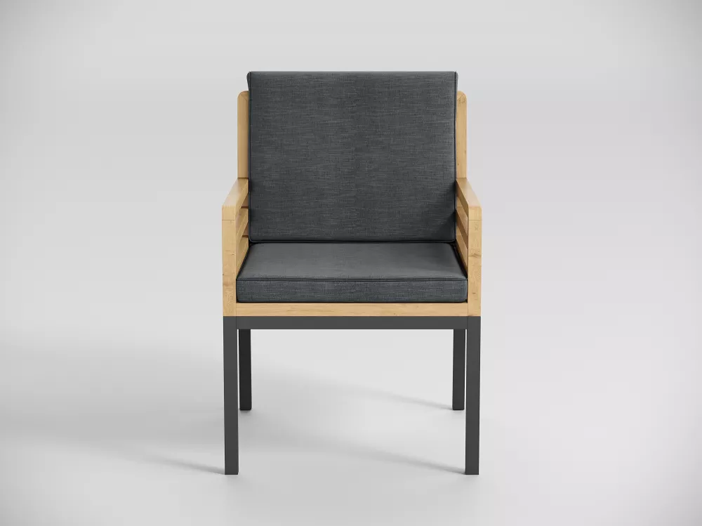 Материалы и цвета: каркас стула изготовлен из тика, подножье выполнено из всесезонного, долговечного алюминия с порошковым покрытием темно - серого цвета (карбон), подушки спинки и сидений обшиты премиальной уличной тканью темно - серого цвета. Ткань устойчива к ультрафиолетовому излучению, водостойкая. Толщина подушек 5 см. Чехлы съемные.