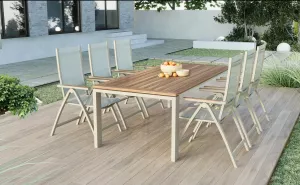 Роскошные столы со столешницей из тикового дерева. Вся конструкция прочная и элегантная.