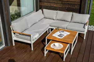 Дополняют конструкцию элементы из массива тика. Мягкие элементы мебели выполнены из водоотталкивающей ткани Олефин.