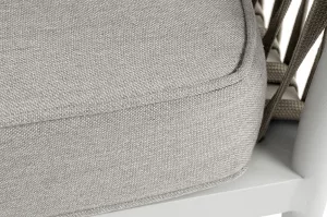 Диван имеет алюминиевый каркас, окрашенный порошковой краской в светло-серый (RAL7035) цвет. Боковины каркаса вручную оплетены плоским роупом - эластичными синтетическими лентами, изготовленными из высокопрочных полиэфирных волокон. Цвет оплетки - серо-коричневый.