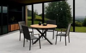 Круглый алюминиевый стол с красивой тиковой столешницей и квадратными ножками+ 4 кресла. Каждая деталь имеет современную эстетику, стильные детали на ножках и рамах, а также превосходный комфорт для сидения. Характеристики