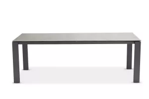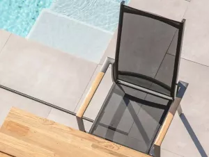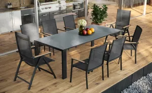 Это роскошные столы со столешницей из спеченного камня. Спеченный камень это новейший продукт современных инноваций, он изготовлен из порошка натурального камня. Таким образом, столешница очень прочная. Материал устойчив к атмосферным воздействиям, устойчив к царапинам и к экстремальным температурам. В комплекте 6 штабелируемых и 2 регулируемых складных кресла с тиковыми подлокотниками.