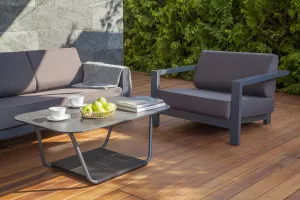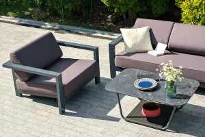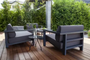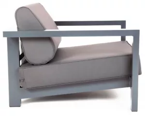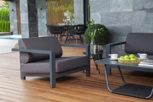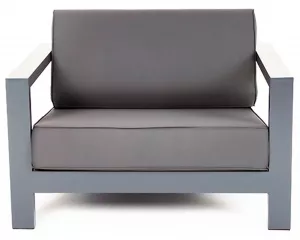 Стильное кресло для создания зоны отдыха. Каркас выполнен из высокопрочного легкого алюминия темно-серого (RAL7024) цвета. На сидениях и спинке предусмотрены подушки темно-серого оттенка.