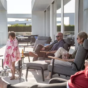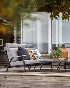 Прямые линии, неподвластный времени дизайн в современном стиле. Низкие сиденья создают дополнительное ощущение современного салона. Захватывающее сочетание разных материалов: алюминий и детали из тика в подлокотниках. Очень удобные подушки из пенопласта с высокой эластичностью и покрытые олефиновой тканью с подкладкой, которая делает их водоотталкивающими. Максимальный комфорт с подушкой для шеи. Группа с красивыми деталями и углами.