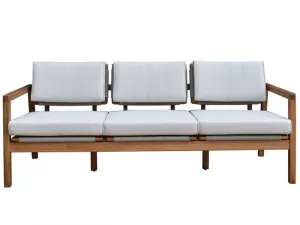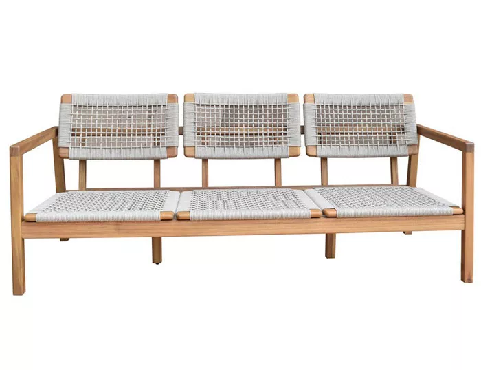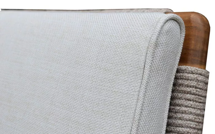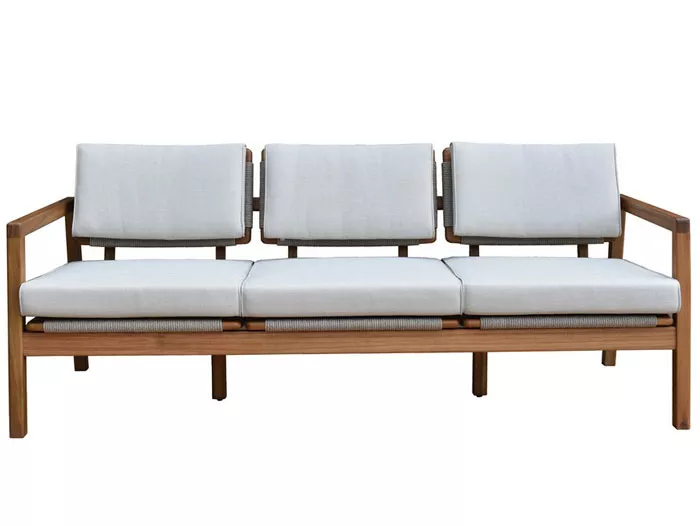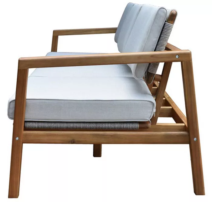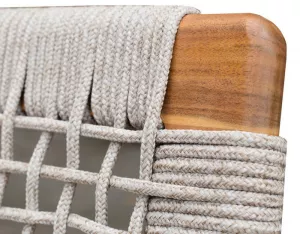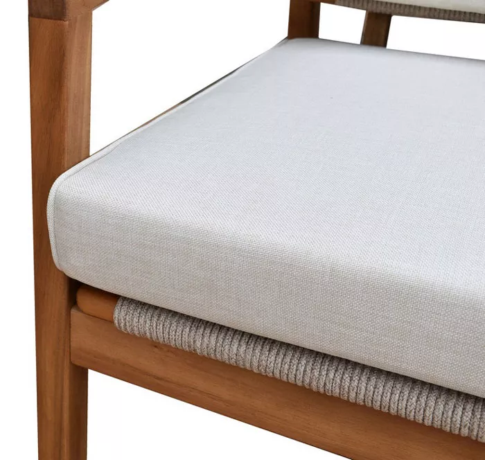 Современная коллекция садовой мебели из акации, выполненная в комбинации натурального веревочного плетения rope, массива акации и бежевых подушек.