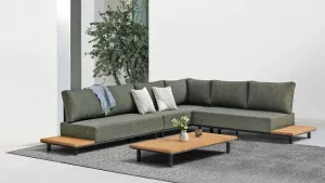Набор имеет гладкую алюминиевую раму, а столешницы сделаны из тика. Роскошные подушки толщиной 22см, чехлы изготовлены из высококачественной, водоотталкивающей и устойчивой к погодным условиям ткани Sunproof®olefin