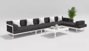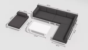 Материалы и цвета: каркас мебели выполнен из всесезонного алюминия с порошковым покрытием белого цвета, подушки спинок и сидений обшиты уличной тканью темно-серого цвета (А13805) с водоотталкивающей пропиткой, толщина подушек 12 см, столешница кофейного столика глянцевая, изготовлена из закаленного стекла толщиной 5 мм с нанесением белого цвета с помощью шелкотрафаретной печати.